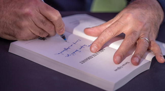 İzmir Büyükşehir Belediye Başkanı Dr. Cemil Tugay, Kültürpark’ta kapılarını açan İZKİTAPFEST - 6. İzmir Kitap Fuarı kapsamında, tutuklu İstanbul Büyükşehir Belediye Başkanı Ekrem İmamoğlu adına gazeteci Yavuz Oğhan’ın kaleme aldığı “Millete Emanet” kitabını İzmirliler için imzaladı. Ekrem İmamoğlu’nun yaşamını, mücadelesini ve ortaya koyduğu çalışmaları anlatan kitabın imza günü, İZKİTAPFEST’in ikinci gününde, Pakistan Pavyonu yanındaki imza alanında gerçekleştirildi. İmza öncesi Kültürpark’a gelen kitapseverlerle kucaklaşan Başkan Tugay, ardından İzmirlilerin kitaplarını imzaladı. Uzun kuyrukların oluştuğu imza etkinliği yaklaşık iki saat sürdü.