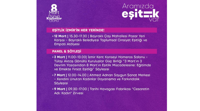 İzmir Büyükşehir Belediyesi, 8 Mart Dünya Kadınlar Günü kapsamında bu yıl "Aramızda Eşitlik Var" temasıyla kentin dört bir yanında kapsamlı bir program hayata geçiriyor. Kültürpark merkezli etkinliklerle emek ve dayanışma yan yana gelirken; kültür, sanat, spor, üretim ve söyleşi buluşmalarıyla 8 Mart’ın eşitlik çağrısı tüm kente yayılıyor.