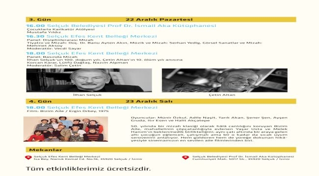 Festivalin üçüncü günü 22 Aralık Pazartesi, saat 16.00’da Prof. Dr. İsmail Aka Kütüphanesi ve Sosyal Etkinlik Merkezi’nde Mustafa Yıldız tarafından gerçekleştirilecek “Çocuklarla Karikatür Atölyesi” ile başlayacak. Saat 16.30’da Selçuk Efes Kent Belleği’nde düzenlenecek “Disiplinlerarası Mizah” panelinde;